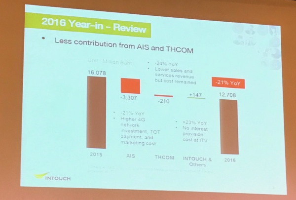 ในปี พ.ศ. 2559 อินทัชมีผลกำไรลดลงจากปีก่อน 21 เปอร์เซ็นต์ อยู่ที่ 12,708 ล้านบาท อันสืบเนื่องมาจากการที่ เอไอเอสมีต้นทุนที่สูงขึ้น ขณะที่ไทยคมมีรายได้ลดลง ทว่าบริษัทก็ยังสามารถจ่ายเงินปันผลได้ตามกำหนดนโยบายเงินปันผล นอกจากนี้ ในปีที่ผ่านมาอินทัชออกจากการลงทุนไป 2 โครงการ โดยได้รับผลตอบแทนจากการลงทุนประมาณร้อยละ 20 รวมทั้งมีการพิจารณาโครงการใหม่ 4 โครงการ เป็นโครงการที่สำเร็จแล้ว 2 โครงการ และอยู่ในระหว่างดำเนินการ 2 โครงการ ทั้งนี้ อินทัชยังคงแสวงหาโอกาสในการลงทุนใหม่ๆต่อไป