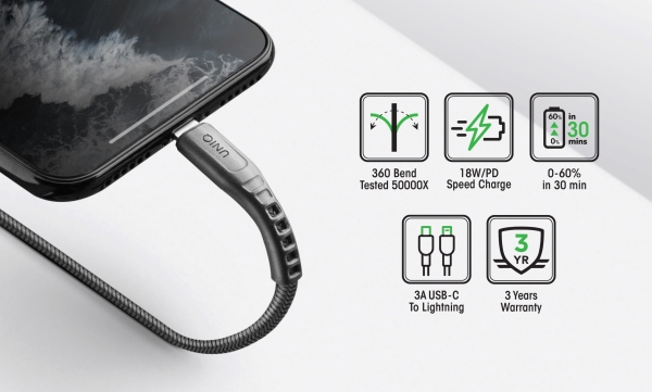 ยูนีค (UNIQ) เป็นแบรนด์ผู้นำผลิตภัณฑ์ Accessories ยอดนิยมที่มีจุดแข็งทั้งในด้านการออกแบบดีไซน์อันเป็นเอกลักษณ์ เทคโนโลยีที่มีความล้ำสมัย และทนทานโดย UNIQ Flex USB-C To Lightning นับเป็นสายชาร์จสมาร์ทโฟนที่ได้รับการออกแบบสำหรับใช้งานกับ iPhone เหมาะสำหรับผู้ที่ชีวิตติดสมาร์ทโฟนหรือต้องเดินทางเป็นประจำ เพราะเป็นสายชาร์จที่ครบเครื่อง จบในเส้นเดียว ทั้งในแง่การดีไซน์ที่พรีเมี่ยมเป็นเอกลักษณ์อย่างมาก และรองรับการชาร์จแบบ Fast Charging ทำให้สามารถชาร์จไฟเข้าสมาร์ทโฟนของคุณได้เร็วกว่าสายทั่วไปยิ่งขึ้น เพียงแค่ 30 นาที แบตเตอรี่ iPhone ก็เพิ่มจาก 0% ไปถึง 60%