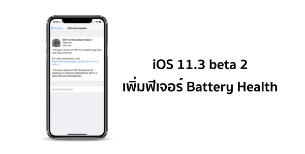 แอปเปิลออกอัปเดท iOS 11.3 Beta 2 ออกมาแล้ว โดยในเวอร์ชั่นนี้ได้เพิ่มฟีเจอร์ Battery Health เพื่อเช็คประสิทธิภาพของแบตเตอรี่