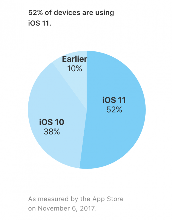 Apple ได้ทำการอัพเดทสถิติของการรัน iOS ต่างๆ ซึ่งพบว่า iOS 11 ถูกรันบนอุปกรณ์มากเกินกว่าครึ่งของอุปกรณ์ทั้งหมด โดยที่ iOS 11 ถูกติดตั้งลงบนอุปกรณ์สูงถึง 52 เปอร์เซ็นต์ iOS 10 มีอยู่ 38 เปอร์เซ็นต์ ส่วน iOS ก่อนหน้านี้ มีอยู่ 10 เปอร์เซ็นต์