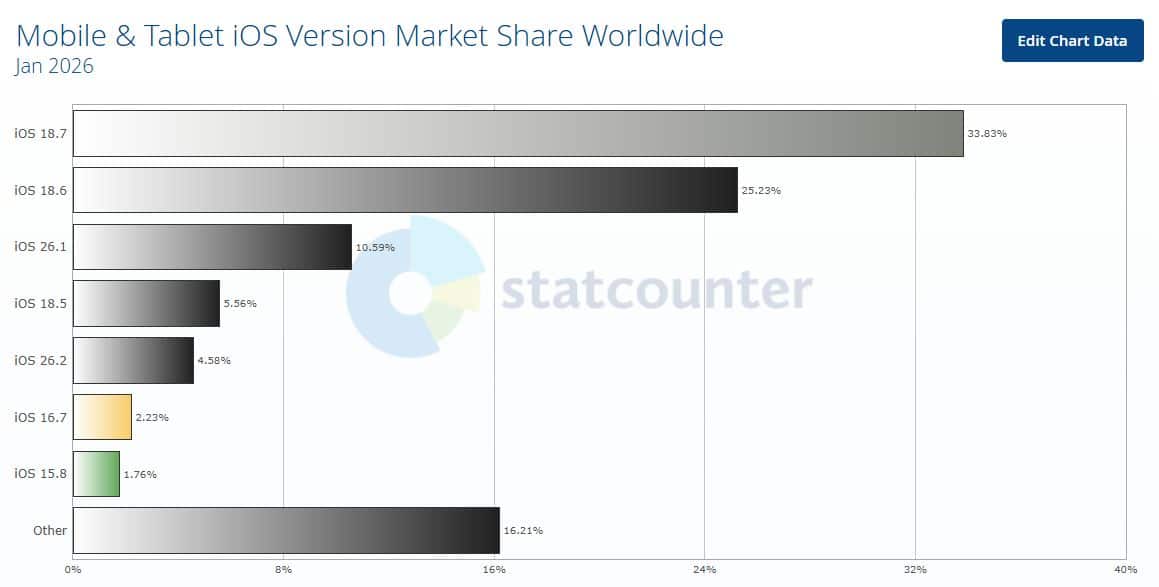 ข้อมูลดังกล่าวมาจาก StatCounter (ผ่านทาง Cult of Mac) สำหรับเดือนมกราคม ปี 2026 ระบุว่ามีประมาณ 15% – 16% ของ iPhone ที่ใช้งานอยู่ทั่วโลกเท่านั้นที่ใช้ iOS 26 เวอร์ชันใดเวอร์ชันหนึ่ง โดยแบ่งเป็น iOS 26.1 ประมาณ 10.6% ตามด้วย iOS 26.2 ประมาณ 4.6% และ iOS 26.0 เวอร์ชันแรก ประมาณ 1.1%