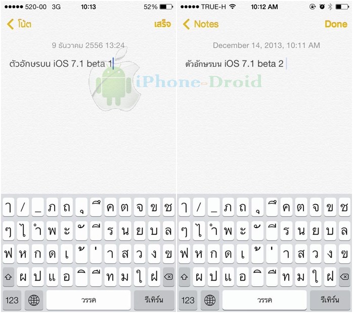 - ตัวอักษรภาษาไทยจะเห็นได้ว่าภาพทางด้านซ้ายมือ iOS 7 beta 1 เทียบกับ iOS 7 beta 2 ภาพทางด้านขวาเปลี่ยนไปเมื่อเขียนข้อความใหม่บนแอพต่าง ๆ แต่ยังเป็นตัว beta เท่านั้นนะครับ ยังไม่รู้ว่าในเวอร์ชั่นเต็มจะเปลี่ยนไปมั้ย