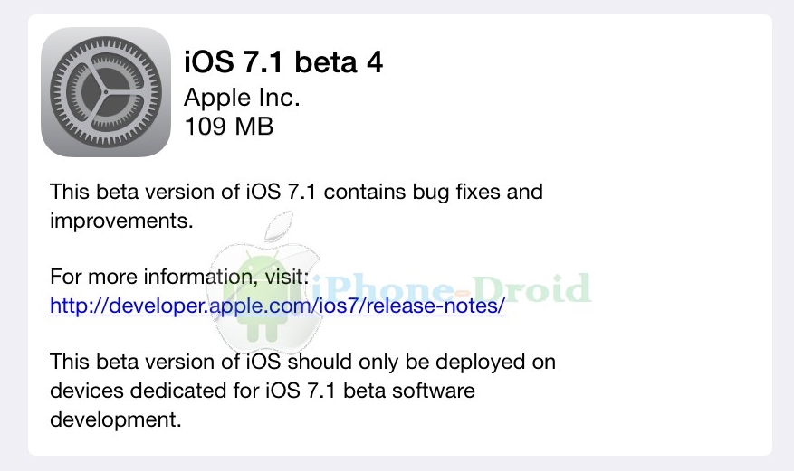 แอปเปิลออกอัพเดท iOS 7.1 beta 4 build (11D513c) สำหรับนักพัฒนาออกมาแล้วเป็นไปตามแหล่งข่าวลือก่อนหน้านี้ ผู้ที่เป็นนักพัฒนาสามารถอัพเดทผ่าน OTA และที่ Apple Developer เว็บไซต์กันได้เลยครับ และสำหรับผู้ที่ไม่ใช่นักพัฒนาไม่แนะนำให้อัพเดทเพราะจะติดล็อคไม่สามารถ Activate เพื่อใช้งานได้