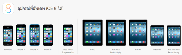 อุปรกรณ์ที่รองรบการอัพเดทเป็น iOS 8 ได้แก่ iPhone 4s, iPhone 5, iPhone 5c, iPhone 5s, iPod touch 5th generation, iPad 2, iPad 3, iPad with Retina display, iPad Air, iPad mini และ iPad mini with Retina display