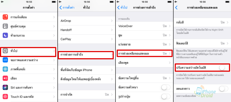 การตั้งค่า > ทั่วไป > การช่วยการเข้าถึง > การช่วยเหลือจอแสดงผล > ปรับความสว่างอัตโนมัติ > ปิด