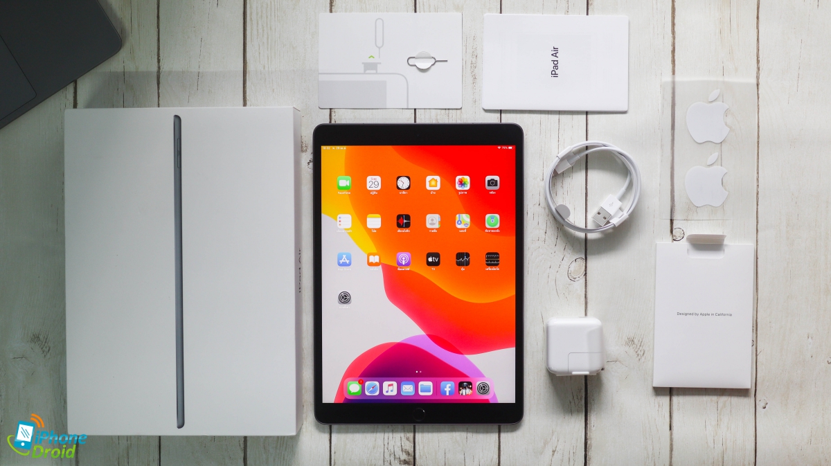 มาเริ่มกันที่ตัวกล่องของ iPad Air (2019) กันครับ ซึ่งก็เป็นเอกลักษณ์ของ Apple ที่จะมีเพียงรูปตัวเครื่องที่ด้านหน้า เมื่อเปิดออกมาก็จะเจอกับอุปกรณ์ต่างๆ ที่ให้มาครบครับ ดังนี้