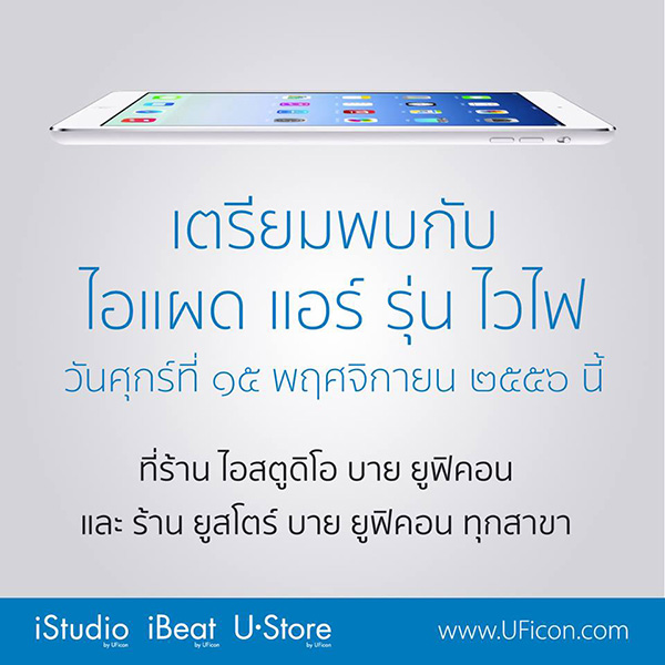 iStudio by UFicon เปิดเผยถึงรายละเอียดการจำหน่าย iPad Air รุ่นไวไฟ ว่าจะเข้ามาวางจำหน่ายในวันศุกร์ที่ 15 พฤศจิกายน 2556 โดยใช้ตัวอักษร และตัวเลขภาษาไทยทั้งหมด เพื่อป้องกันการเปิดเผยข้อมูลก่อนถึงเวลาที่กำหนดไว้