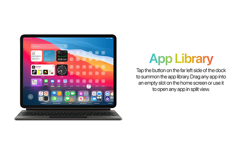 ใน iPadOS 14 ตอนนี้สามารถเพิ่ม Widget เข้าไปแค่ที่หน้าแรกได้เท่านั้น ซึ่ง Ortolani ได้ทำการเปลี่ยนแปลงดีไซน์การใช้งาน ตั้งแต่ผู้ใช้งานสามารถวาง Widget ได้ที่ใดก็ได้ตามใจชอบแม้แต่ในที่ว่าง โดยการใช้งาน App Library จะใช้งานได้เพียงแค่ปัดขึ้นจากหน้าจอส่วนล่าง