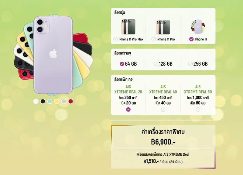 AIS XTREME Deal เป็นโปรโมชันที่จะช่วยทำให้เป็นเจ้าของ iPhone ได้ง่ายมากขึ้น โดยที่ไม่ต้องจ่ายเงินไปเป็นก้อน ไม่ต้องนำวงเงินบัตรเครดิตจ่ายไปทั้งหมด หรือใครที่ไม่มีบัตรเครดิตก็ซื้อได้ เช่น iPhone 11 รุ่น 64 GB ก็จ่ายครั้งแรกง่ายๆ เพียงแค่ 6,900 บาท รับเครื่องไปใช้งานได้เลย ไม่ต้องจ่ายล่วงหน้าด้วยนะ ค่อยไปจ่ายแต่ละเดือน เดือนละ 1,510.- บาท นาน 24 เดือน