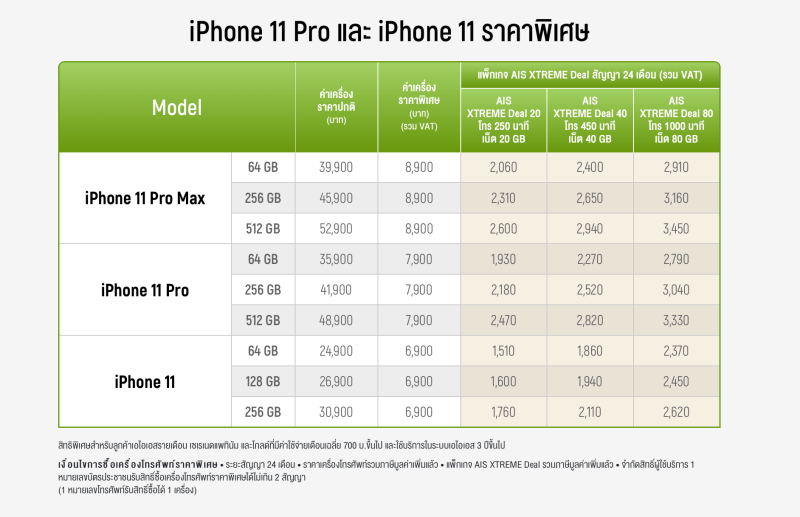 นอกจาก iPhone 11 ยังมี iPhone 11 Pro ความจุ 64 GB จ่ายครั้งแรก 7,900 บาท และ iPhone 11 Pro Max ความจุ 64 GB จ่ายครั้งแรก 8,900 บาท ให้เลือกซื้อได้ด้วยเช่นกัน ทั้งหมดทุกรุ่นนี้จะมีสัญญาการใช้งาน 24 เดือน เป็นโปรที่ใครใช้ iPhone ยาวๆ 2 ปีจะเปลี่ยนกันสักครั้ง และใช้แพ็กเกจรายเดือนอยู่แล้ว ก็เรียกได้ว่าคุ้มค่ามากๆ เลยทีเดียว การซื้อ iPhone ด้วยโปรนี้จะต้องเลือกสมัครแพ็กเกจ AIS XTREME Deal 20, AIS XTREME Deal 40 หรือ AIS XTREME Deal 80 นะครับ เลือกเองตามการใช้งานได้เลย