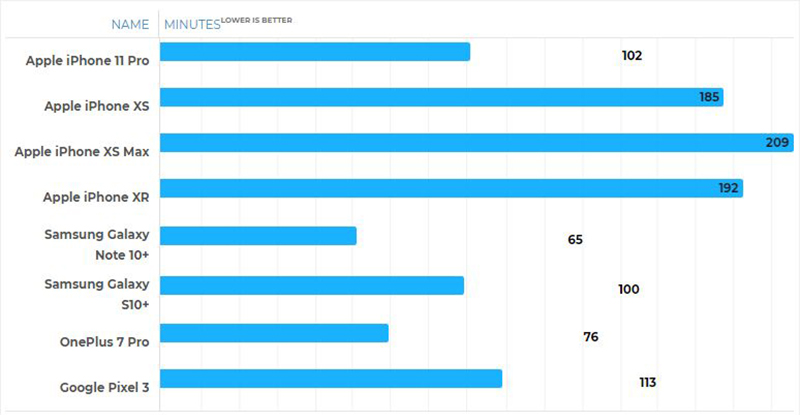 เราจะเห็นได้ว่าเมื่อใกล้จะเต็มเมื่อไหร่ การชาร์จเหมือนจะใช้เวลามากขึ้น ซึ่งเป็นปกติของการชาร์จไฟเข้าสมาร์ทโฟนอยู่แล้ว โดยเมื่อเทียบสถิติเวลาการชาร์จของ iPhone 11 Pro กับ iPhone และ Android รุ่นอื่นๆ มีดังนี้ (ซ้ายคือชื่อรุ่น และขวาคือนาที)