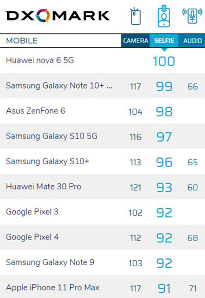 DxOMark ปล่อยคะแนนกล้องหน้า iPhone 11 Pro Max ออกมาเรียบร้อย โดยติดอันกับที่ 10 ของตาราง โดยได้คะแนนเพิ่มขึ้นจาก iPhone XS Max ถึง 9 คะแนน (จากเดิม 82 คะแนน)