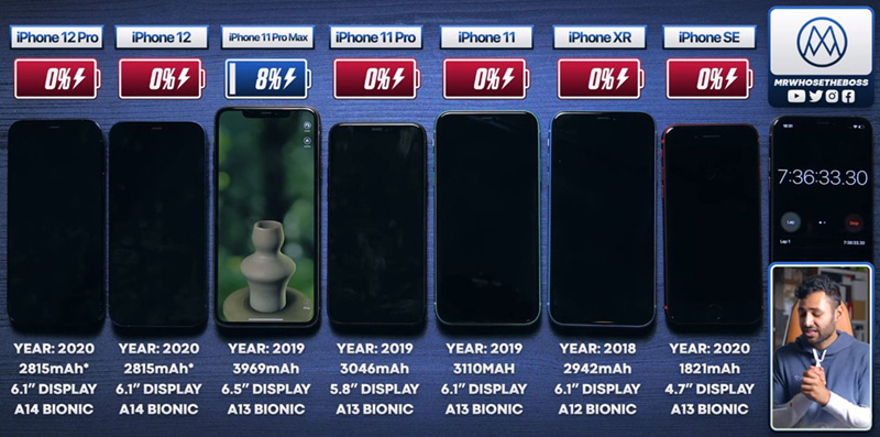 Arun Maini เจ้าของช่อง YouTube อย่าง Mrwhosetheboss ได้ทำการทดสอบความอึดของแบตเตอรี่ iPhone 12 และ iPhone 12 Pro ต่อการชาร์จ 1 ครั้ง โดยเทียบกับ iPhone 11, iPhone 11 Pro, iPhone 11 Pro Max, iPhone XR และ iPhone SE (2020) ที่ตั้งค่าทุกอย่างเท่ากัน พร้อมใช้ iOS 14 ทุกรุ่น และไม่ได้ใส่ซิมทั้งหมด