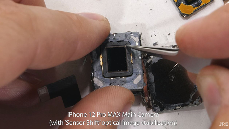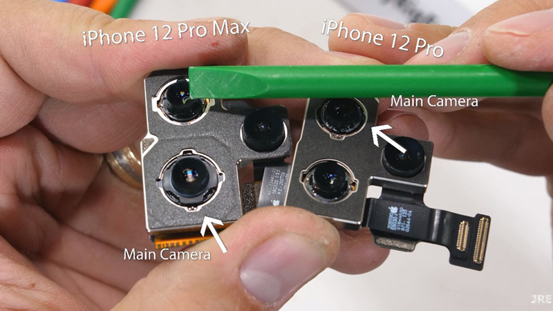 JerryRigEverything ได้แกะ iPhone 12 Pro Max โดยหลักๆ ตัวกล้องของรุ่นนี้จะใหญ่กว่า iPhone 12 Pro เพราะมีเซ็นเซอร์ที่ใหญ่กว่าเล็กน้อยเพื่อการรับแสงได้มากขึ้น รวมไปถึงการวางตำแหน่งของแต่ละเลนส์ก็ต่างกัน โดย iPhone 12 Pro Max เลนส์หลักจะอยู่ที่ด้านล่าง ส่วน iPhone 12 Pro เลนส์หลักจะอยู่ที่ด้านบน