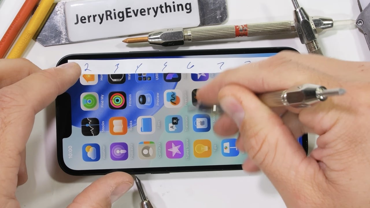 โดยในการทดสอบยังคงมาในรูปแบบเดิมของช่อง ไม่ว่าจะเป็นการทดสอบหน้าจอจากการขูดขีดหลายระดับ หน้าจอ iPhone 17e อัปเกรดมาเป็น Ceramic Shield 2 แล้ว เคลมว่าทนทานกว่า 16e ถึง 3 เท่า ซึ่งในการทดสอบก็ทนจริงครับ ในระดับ 6 แทบไม่เกิดรอยเลย