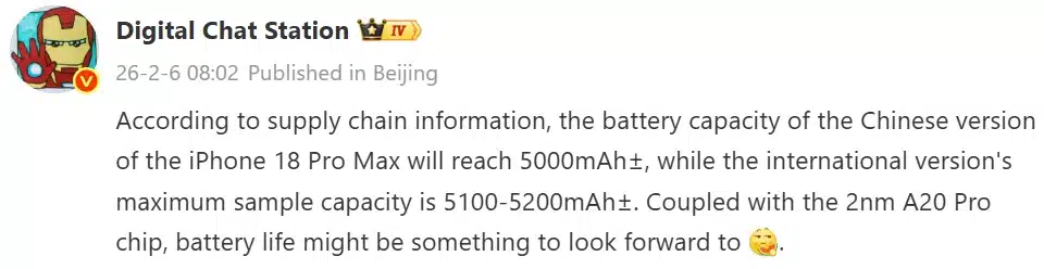 iPhone รุ่นล่าสุดเป็นรุ่นแรกของ Apple ที่ให้แบตเตอรี่มาเยอะกว่า 5000mAh อยู่ที่ 5088mAh ล่าสุด จอมหลุดชือดังในจีนอย่าง Digital Chat Station ก็บอกเพิ่มเติมด้วยว่า iPhone 18 Pro Max ตัวท็อปสุดของปีนี้จะได้แบตฯ ที่มากกว่า 5000mAh และมากกว่า iPhone 17 Pro Max ด้วยครับ