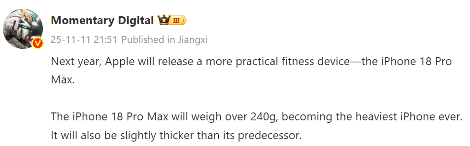 โดยข้อมูลใหม่เผยว่า iPhone 18 Pro Max อาจมีน้ำหนักมากถึง 240 กรัม (iPhone 17 Pro Max 233 กรัม) รวมถึงความหนาตัวเครื่องก็จะเพิ่มขึ้นเป็น 9 มม. (17 Pro Max 8.8 มม.) นั่นไม่ใช่แค่หนักที่สุดแล้ว แต่ยังหนาที่สุดอีกต่างหาก