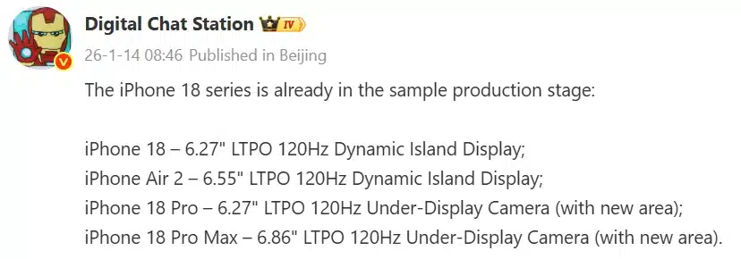 ปีนี้ iPhone 18 Series คาดว่าจะมีการเปิดตัวแยกกันเป็น 2 รอบ คือรุ่น Pro ในช่วงปลายปีนี้ และรุ่นธรรมดาในช่วงต้นปี 2027 แต่ล่าสุด Digital Chat Station จอมแม่นของฝั่งจีนได้เผยสเปคหน้าจอของทั้ง 4 รุ่นในตระกูลนี้ (รวม Air) ออกมาด้วย