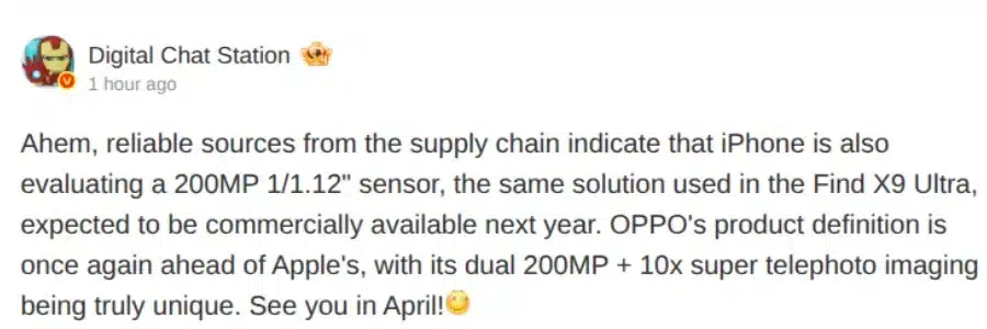 โดย Digital Chat Station จอมหลุดคนดัง ได้ออกมาเผยว่า Apple กำลังทดสอบกล้อง 200MP เซ็นเซอร์ 1/1.12″ อยู่ ซึ่งเป็นเซ็นเซอร์ขนาดใหญ่แบบเดียวกับที่จะใช้บน Find X9 Ultra!