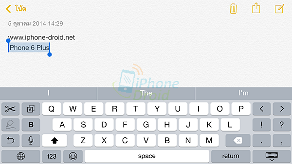 แอพ Note เมื่อแสดงผลในแนวนอน แป้นพิมพ์จะแสดงปุ่มเครื่องมือสำหรับการคัดลอก ตัดแปะ และวางให้ด้วย