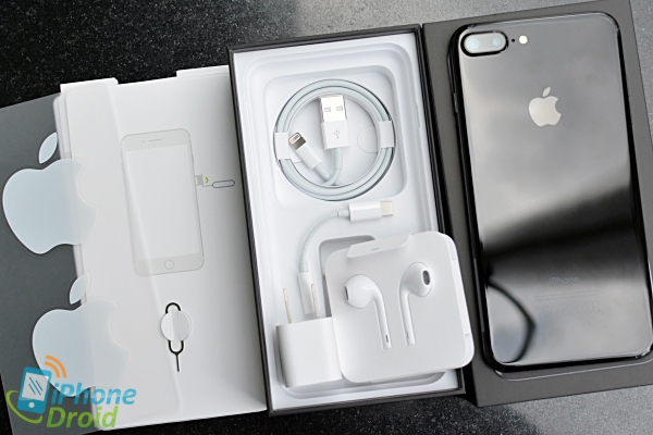 เมื่อแกะเปิดฝากล่องออกมา จะพบกับคู่มือใช้งานที่มีเข็มจิ้มถาดใส่ซิมกับสติกเกอร์แอปเปิลอยู่บนสุด ตามมาด้วยตัวเครื่อง iPhone 7 Plus สีเจ็ทแบล็คที่ปิดด้วยฟิล์มพลาสติกใสทั้งด้านหน้าและด้านหลัง