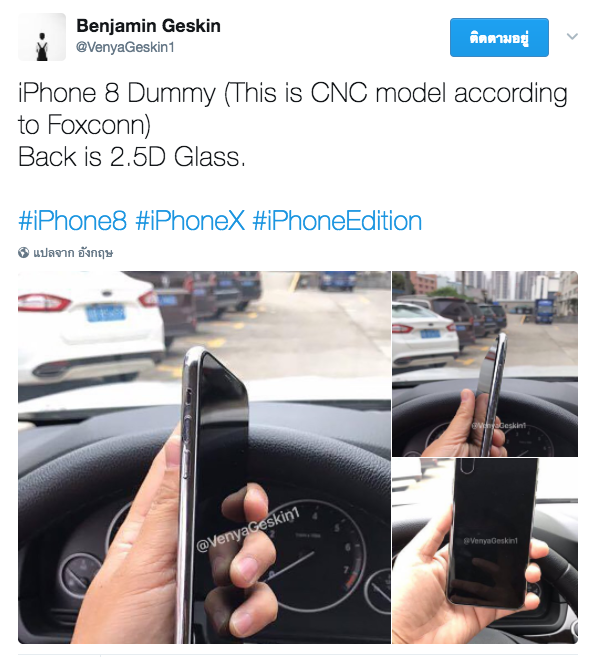 แหล่งข่าวเผยภาพอ้างเป็นตัวเครื่องดัมมี่ iPhone 8 ที่มีฝาหลังเป็นกระจกโค้งมนแบบ 2.5D เหมือนกับกระจกหน้าจอ ตรงกับที่เคยมีข่าวลือก่อนหน้านี้