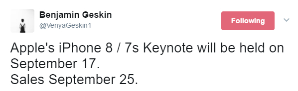 Benjamin Geskin แหล่งข่าวชื่อดังบนทวิตเตอร์ที่เคยออกมาโพสต์ข้อมูลเกี่ยวกับสมาร์ทโฟนรุ่นใหม่มาแล้วหลายครั้ง โดยในครั้งนี้ได้ออกมาพูดถึงกำหนดการเปิดตัว iPhone 8 / iPhone 7s ที่จะมีขึ้นในวันที่ 17 กันยายนนี้ และเริ่มวางขายในกลุ่มประเทศแรกวันที่ 25 กันยายนนี้