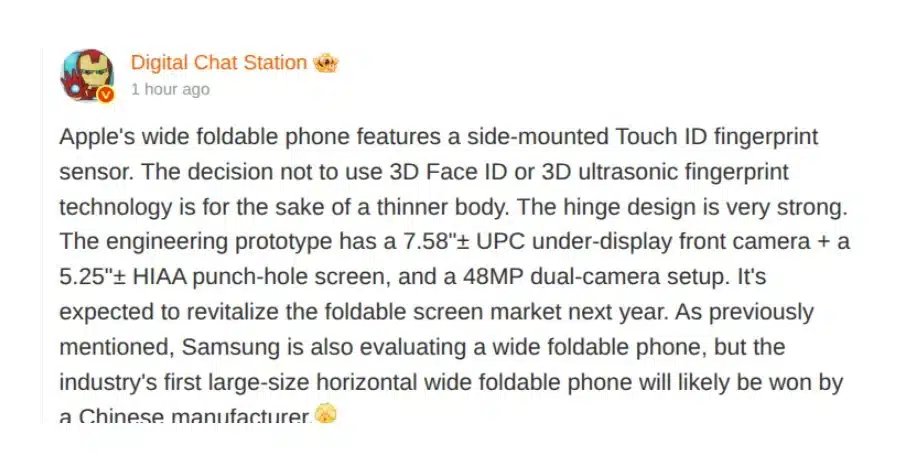 โดย DCS เผยว่า iPhone Fold จะเลือกใช้ระบบสแกนลายนิ้วมือ Touch ID ที่ด้านข้างตัวเครื่อง (คล้าย iPad Air) แทนที่จะเป็นระบบสแกนใบหน้า Face ID หรือสแกนลายนิ้วมือบนหน้าจอแบบ 3D เพื่อให้ตัวเครื่องนั้นบางเฉียบ