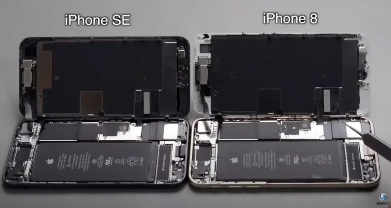 เราจะเห็นว่าส่วนประกอบของทั้ง 2 รุ่นนี้คล้ายกันมาก ซึ่งจะต่างกันแค่เพียงชิป Wi-Fi, สายเชื่อมแบตเตอรี่ที่ iPhone SE (2020) เป็นแบบเดียวกับ iPhone 11 และการติดตั้งไฟแฟลช