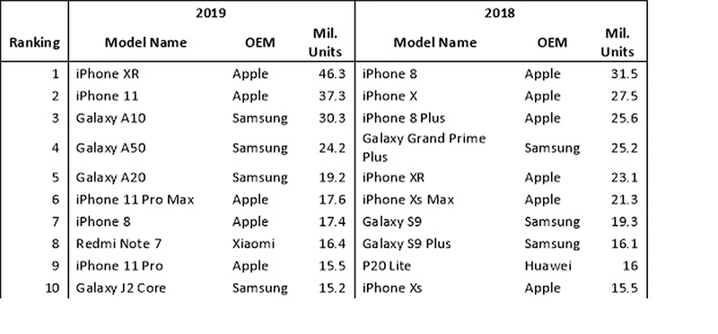 จากตาราง iPhone XR ทำยอดขายไปได้ถึง 46.3 ล้านเครื่องในปี 2019 และตามมาด้วย iPhone 11 ที่ขายได้ถึง 37.3 ล้านเครื่องแม้ว่าจะเปิดตัวในช่วงปลายปีที่ผ่านมาก็ตาม