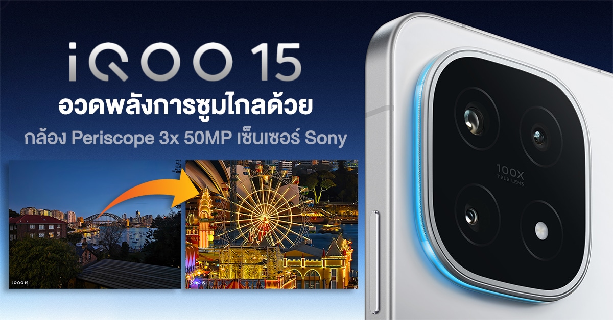 โดย iQOO 15 ยืนยันสเปคแล้วว่าจะได้สเปคกล้อง Periscope ความละเอียด 50MP เซ็นเซอร์ Sony ระยะ Optical 3x และสามารถซูมแบบ In-Sensor ได้ถึง 6x รวมถึงซูมแบบ Digital สูงสุด 100x เลยด้วย