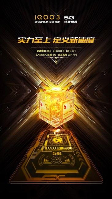 สำหรับสเปคของ iQOO 3 5G ที่ยืนยันแล้ว คือจะมาพร้อมหน่วยประมวลผล Snapdragon 865, RAM LPDDR5 + ROM UFS 3.1 มีกล้องหลัง 48 ล้านพิกเซล, รองรับ Wi-Fi 6 และมีแบตเตอรี่ความจุ 4440mAh รองรับ 55W Flash SuperCharge สามารถชาร์จถึง 50% ในเวลา 15 นาที ทั้งยังรองรับ 5G ด้วย