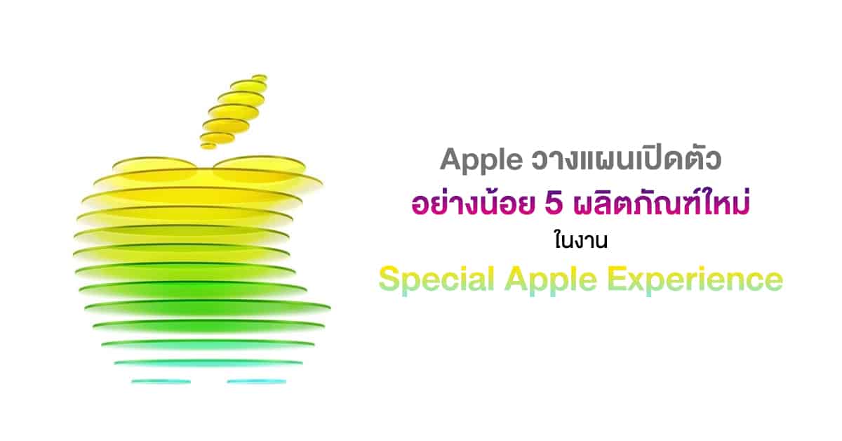 ในต้นเดือนมีนาคมนี้ Apple จะมีการจัดงาน Special Apple Experience ที่เป็นการเปิดตัวผลิตภัณฑ์รุ่นใหม่ต่างๆ ซึ่งตอนนี้มีรายงานว่าการเปิดตัวน่าจะมีอย่างน้อย 5 อย่างเลยทีเดียวครับ