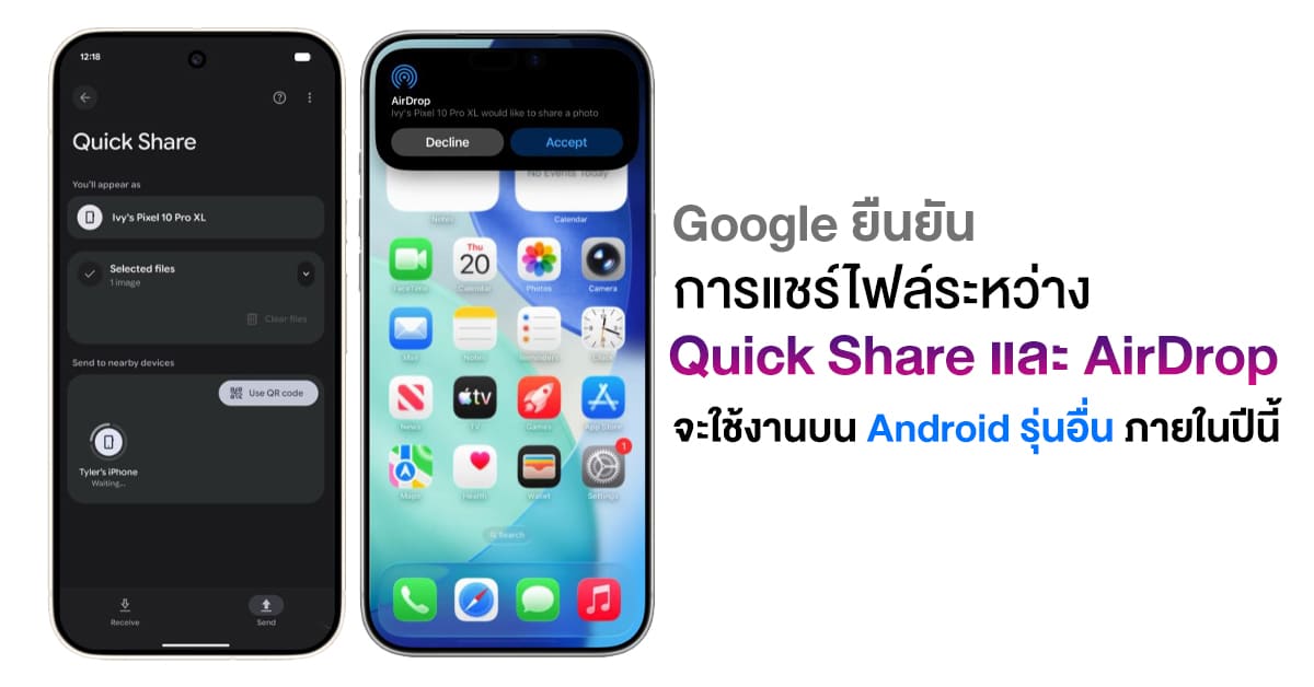 ก่อนหน้านี้ Google ได้ปล่อยฟีเจอร์การทำงานการแชร์ไฟล์ระหว่าง Quick Share และ AirDrop ที่ส่งไฟล์ระหว่างอุปกรณ์ Pixel 10 Series และ iPhone ได้แล้ว ล่าสุด ก็มีการยืนยันอย่างเป็นทางการแล้วว่า Android รุ่นอื่นๆ ก็เตรียมใช้งานได้แล้วภายในปีนี้ครับ
