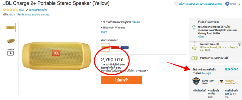 สำหรับ JBL Charge 2+ นำเข้ามาขายโดย Mahajak Development Co., Ltd. ไม่ต้องกังวลเรื่องของการจัดส่งและรับประกันสินค้า ใครเล็งอยู่รีบจิ้มไปด่วน เหลือไม่กี่สีแล้ว www.lazada.co.th/jbl-charge-2-portable-stereo-speaker-yellow-1947827.html