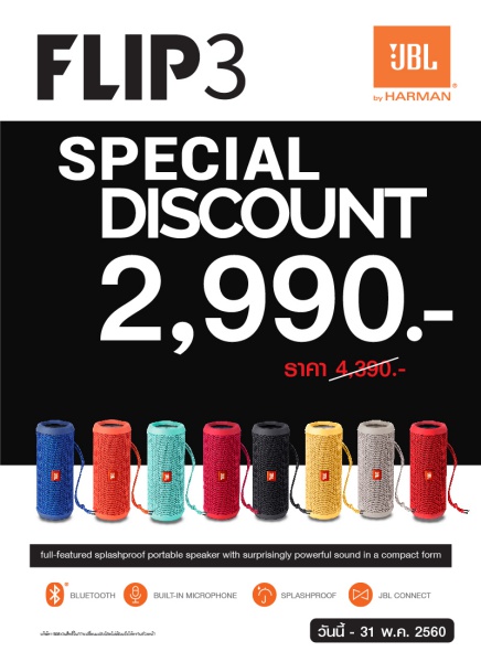 ลดหนักจัดเต็ม ลำโพง JBL Flip3 ทุกสี จากปกติ 4,390 บาท ลดเหลือเพียง 2,990 บาทเท่านั้น