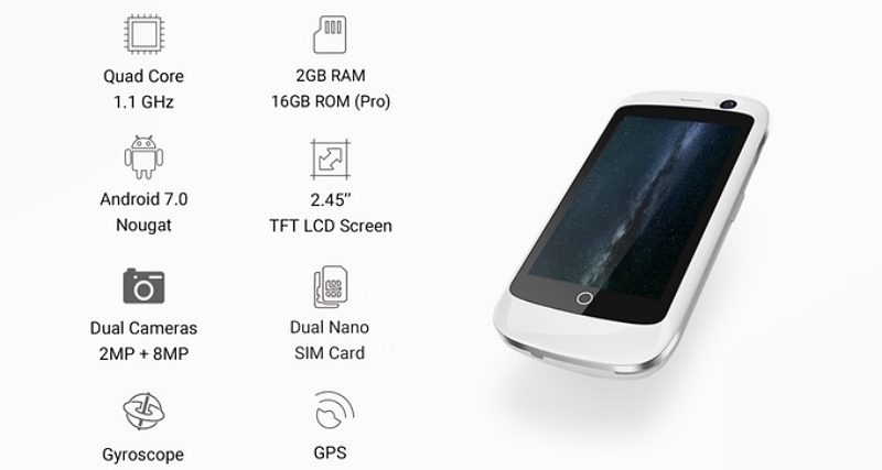 Jelly มีขนาดตัวเครื่องเล็กเพียง 92.3 x 43 x 13.3 มิลลิเมตร หน้าจอแสดงผลขนาด 2.45 นิ้ว ความละเอียด 240 x 432 พิกเซล หากเทียบขนาดกับสมาร์ทโฟนในปัจจุบันแล้วดูเหมือนว่าสมาร์ทโฟนตัวจิ๋วนี้จะกลายเป็นของเล่นไปเลย โดยตัวเครื่องมาพร้อมระบบปฏิบัติการ Android 7.0 Nougat และรองรับการใช้งานบนเครือข่าย 4G LTE