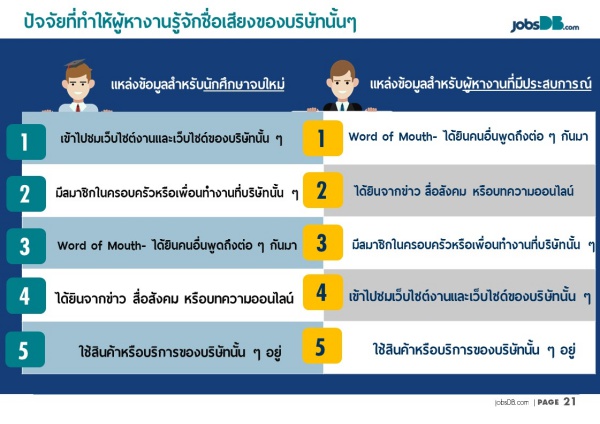 นอกจากนี้การหางานผ่านอินเทอร์เน็ตยังเป็นช่องทางที่ได้รับความนิยม รายงาน jobsDB’s 2016 Top Companies ชี้ให้เห็นว่าผู้หางานส่วนใหญ่มักค้นคว้าและศึกษาข้อมูลขององค์กรที่สนใจผ่าน 3 ช่องทางดังนี้ การได้ยินคนอื่นพูดต่อๆ กันมา เครือข่ายเพื่อนฝูงหรือครอบครัว และอินเทอร์เน็ตโดยเฉพาะอย่างยิ่งผ่านโซเชียลมีเดีย ข่าวออนไลน์ และเว็บไซต์ของบริษัท ขณะที่การได้ยินคนอื่นพูดต่อๆ กันมาและได้ยินจากข่าวและโซเชียลมีเดียเป็นช่องทางที่ผู้หางานไทยให้ความสำคัญกับการหาข้อมูลขององค์กรนั้นๆ โดยคิดเป็น 20% ขณะที่การนำแนะจากครอบครัวหรือเพื่อนมาเป็นอันดับที่สอง (16%) และจากการเข้าไปชมเว็บไซต์ของบริษัทหรือเว็บไซต์รับสมัครงานอยู่ในอันดับที่ 3 (15%)
