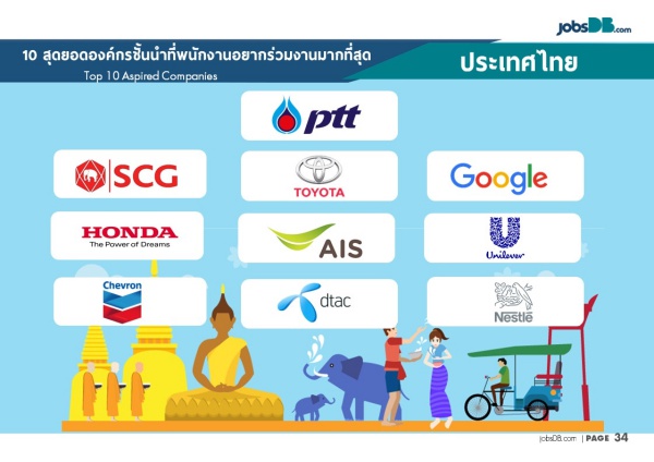 บริษัท จัดหางาน จ๊อบส์ ดีบี (ประเทศไทย) จำกัด เว็บไซต์หางานชั้นนำของเอเชีย เผย 10 อันดับบริษัทที่คนอยากเข้าทำงานมากที่สุดในประเทศไทย พบว่า 4 ใน 10 ขององค์กรน่าทำงานที่เหล่ามนุษย์เงินเดือนชาวไทยใฝ่ฝันอยากเข้าทำงานเป็นบริษัทสัญชาติไทยและยังติด 2 อันดับแรกของบริษัทที่น่าทำงานที่สุดในประเทศไทย