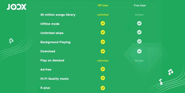 ตารางเปรียบเทียบระหว่าง JOOX VIP และ การใช้งานฟรี