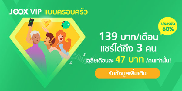 JOOX Family Plan แพคเกจ VIP สำหรับสมาชิกในครอบครัว แชร์กันได้ถึง 3 คน เพียงแค่ 139 บาทต่อเดือน เฉลี่ยเดือนละ 47 บาทต่อคนเท่านั้น!
