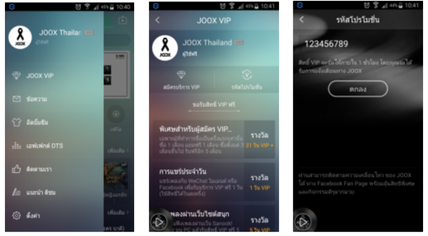 • จากนั้นเลือก “รหัสโปรโมชั่น” และกรอกรหัสโปรโมชั่นบนบัตรเติมเงิน JOOX VIP Card ที่ช่อง “ระบุรหัสโปรโมชั่น” และกด “ตกลง”