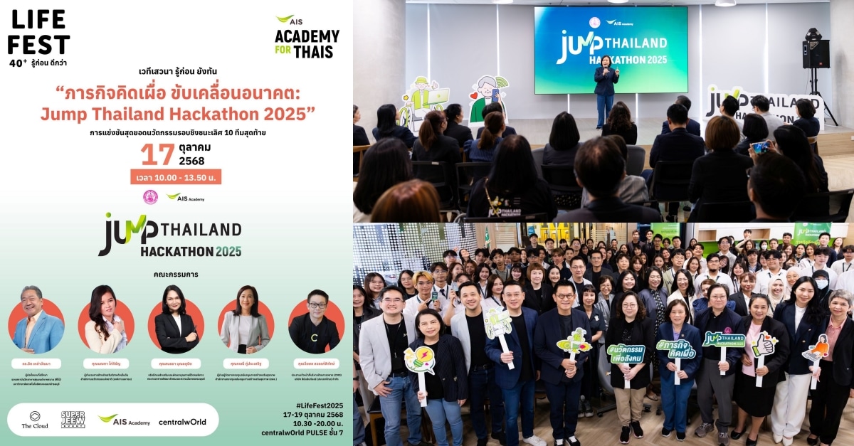 ขอเชิญชวนทุกท่านมาร่วมเชียร์และเป็นกำลังใจให้กับน้อง ๆ นิสิต นักศึกษา 10 ทีมสุดท้ายของโครงการ JUMP THAILAND Hackathon 2025 ในงาน AIS ACADEMY for THAIs at LIFE FEST 40+ วันศุกร์ที่ 17 ตุลาคม 2568 เวลา 10.00 – 14.00 น. ณ @centralwOrld PULSE ชั้น 7 ผู้สนใจสามารถลงทะเบียนเข้าร่วมงานฟรี ดูรายละเอียดเพิ่มเติมที่เพจ AIS Academy