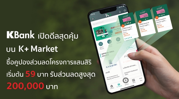 ธนาคารกสิกรไทย จับมือ แสนสิริ จัดแคมเปญ “จ่ายหลักสิบ ลดหลักแสน” ให้ลูกค้าได้ซื้อคูปองส่วนลด (E-Voucher) บน K+ Market ผ่าน K PLUS ในราคาเริ่มต้นเพียง 59 บาท รับส่วนลดสูงสุดถึง 200,000 บาท สามารถนำไปใช้เป็นส่วนลดสำหรับโครงการของแสนสิริทั้งคอนโดมิเนียม บ้านเดี่ยว และทาวน์โฮม รวม 30 โครงการ โดยลูกค้าสามารถซื้อด้วยเงินสด หรือใช้คะแนนสะสมบัตรเครดิตกสิกรไทยแลกซื้อดีลคูปองส่วนลดดังกล่าวได้ ตั้งแต่วันนี้ถึง 31 สิงหาคม 2563