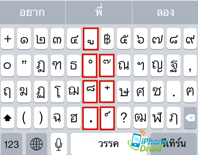 เป็นทิปเล็กๆ น้อยๆ ที่เอามาฝากสำหรับมือใหม่และเพื่อนๆ ที่ใช้ iOS อาจจะยังไม่ทราบกันครับ ปกติแล้วในการพิมพ์วรรณยุกต์, สระ ู ๋ ๊ ็ ์ เป็นต้นเราจะต้องกด Shift ที่คีย์บอร์ดก่อนถึงจะสามารถพิมพ์ได้แบบภาพด้านล่างมีวิธีพิมพ์ที่ไม่ต้องกดปุ่ม Shift มาฝากกันครับ