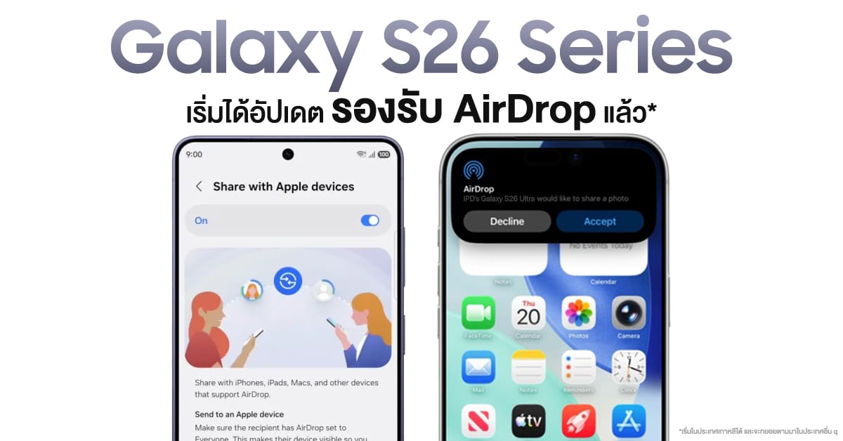 วันก่อนมีข่าวว่า Galaxy S26 Series จะรองรับฟีเจอร์ Quick Share หาอุปกรณ์ Apple ผ่าน AirDrop ล่าสุด Samsung ก็ยืนยันแล้วว่า Galaxy S26 Series จะเริ่มได้อัปเดตตั้งแต่วันที่ 23 มีนาคมนี้เป็นต้นไปครับ