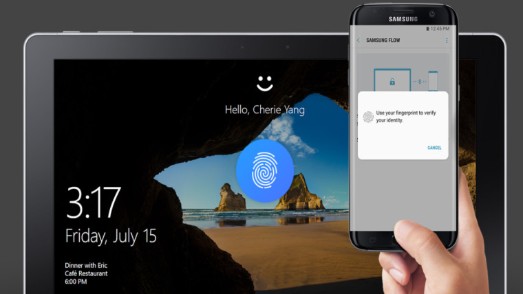 จุดเด่นของ Samsung Flow คือการสแกนลายนิ้วมือบนสมาร์ทโฟนหรือแท็บเล็ตของ Samsung เพื่อปลดล็อคเครื่องให้กับแท็บเล็ตหรือพีซีที่รันระบบปฏิบัติการ Windows 10 ได้ทุกแบรนด์ ไม่ได้จำกัดเฉพาะแบรนด์ของ Samsung เพียงเชื่อมต่อกันผ่าน Bluetooth และลงทะเบียนการใช้งานในครั้งแรกเข้ากับ Windows Hello