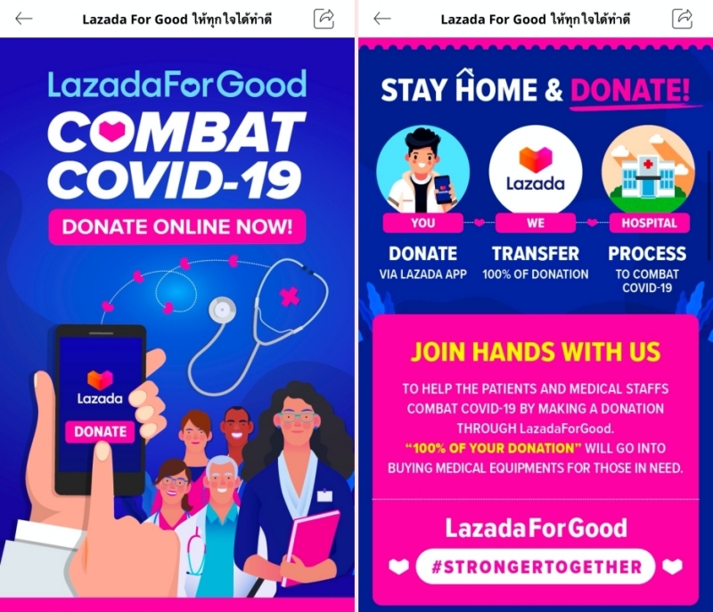 ลาซาด้า ประเทศไทย เปิดตัวโครงการ “LazadaForGood ให้ทุกใจได้ทำดี” ช่องทางการบริจาคออนไลน์เพื่อสนับสนุนองค์กรไม่แสวงหาผลกำไร พร้อมมอบเงินบริจาครวม 3 ล้านบาทแก่โรงพยาบาล ทั้งหมดนี้มีจุดประสงค์เพื่อสนับสนุนบุคลากรทางการแพทย์และสาธารณสุขในการต่อสู้กับไวรัสโควิด-19