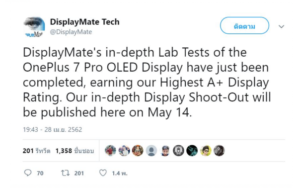 การจะเป็นสุดยอด Super Flagship สมาร์ทโฟนได้นั้น ต้องใส่ใจทุกรายละเอียด คำนึงถึงการใช้งาน รวมถึงประสิทธิภาพของการประมวลผล ซึ่งแน่นอนอยู่แล้วว่าปัจจุบันนี้ผู้คนใช้งานบนหน้าจอสมาร์ทโฟนแทบจะทุกวัน เหนือกว่าสิ่งอื่นใดหน้าจอสมาร์ทโฟนนั้นเป็นสิ่งที่ผู้ใช้งานทุกคนต้องดู ใช้งาน และสัมผัสอยู่ตลอดเวลา ซึ่งในครั้งนี้ OnePlus ภาคภูมิใจอย่างยิ่งว่า OnePlus 7 Pro Super Flagship สมาร์ทโฟนรุ่นใหม่สุดพรีเมี่ยม กับหน้าจอ OLED ได้รับคะแนนผลทดสอบรีวิวหน้าจอแสดงผลบนสมาร์ทโฟนออกมาอยู่ที่ A+ ซึ่งเป็นคะแนนที่สูงที่สุด ถือว่าเป็นการทำลายสถิติของการทดสอบหน้าจอแสดงผลบนสมาร์ทโฟนที่เคยมีมา ทำให้ OnePlus 7 Pro กลายเป็นสมาร์ทโฟนพรีเมี่ยมที่มีหน้าจอที่ดีที่สุด ขณะนี้จาก DisplayMate ผู้เชี่ยวชาญทางด้านการทดสอบจอภาพแสดงผลชั้นนำของโลก เป็นที่รู้จักและเชื่อมั่นในองค์กรที่ดำเนินการทดสอบที่ครอบคลุมถึงการทำวิจัยเชิงลึก และการทดสอบวัดค่าแสดงผลสำหรับหน้าจอแสดงผลบนสมาร์ทโฟน