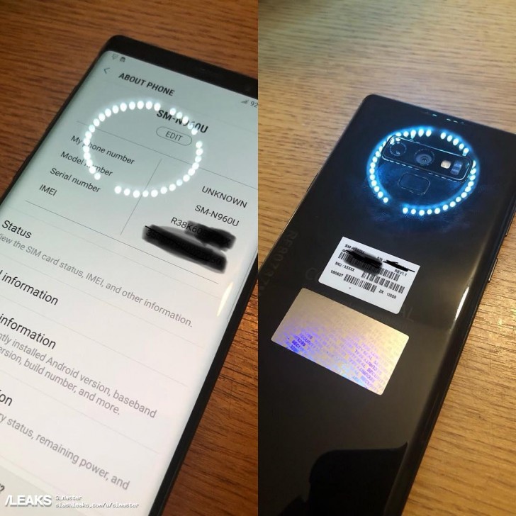 ล่าสุดมีภาพหลุดออกมาให้เห็นหน้ารายละเอียดของเครื่อง (About) ที่มีทั้งรายละเอียดเกี่ยวกับตัวเครื่อง และภาพที่ 2 ที่หลุดออกมาพร้อมกันจะเป็นด้านหลังของ Samsung Galaxy Note 9 ที่มีกล้องคู่แนวนอน และมี LED Flash อยู่ข้างๆ พร้อมกับเซนเซอร์วัดชีพจรการเต้นของหัวใจอยู่ติดกัน ด้านล่างของกล้องคู่จะเป็นเซ็นเซอร์สแกนรายนิ้วมือที่ปรับเปลี่ยนมาไว้ด้านหลังแทน